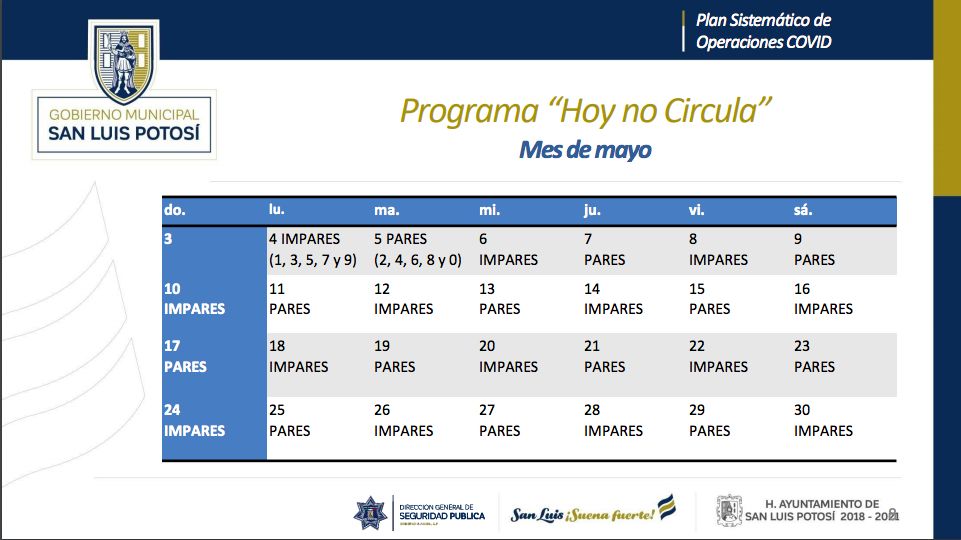Por decisión del presidente municipal de San Luis Potosí, Xavier Nava Palacios, a partir del próximo lunes 4 de mayo se aplica el programa “Hoy no circula” y se procede al cierre total de las avenidas: Salvador Nava, Río Santiago, Río Españita y el primer cuadro del Centro Histórico.