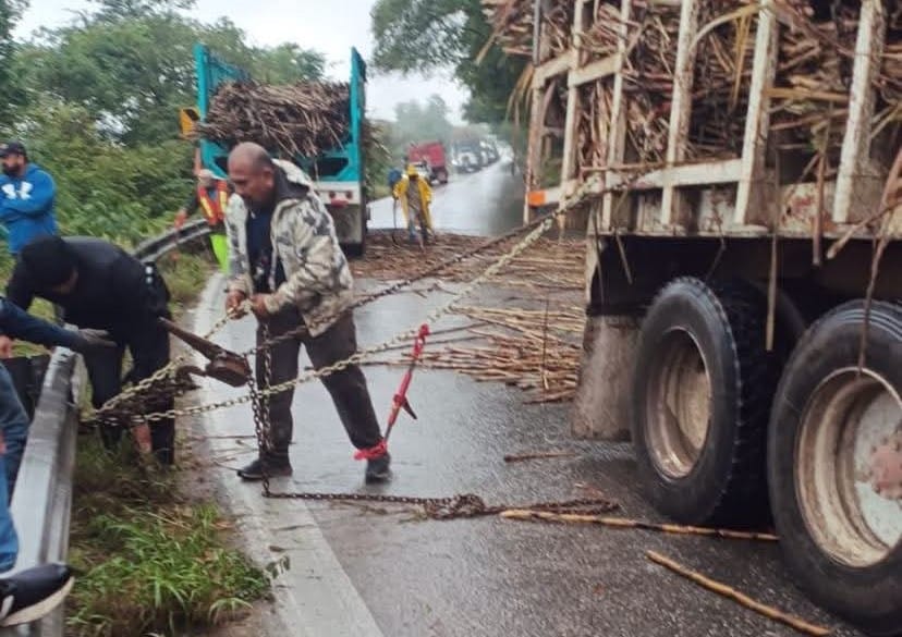 El incidente ocurrió cuando la pesada unidad perdió estabilidad al tomar la curva, presuntamente por una falla mecánica o por el peso de la carga, lo que obligó a detener la circulación para evitar una volcadura mayor. Ante el riesgo, autoridades y cuerpos de auxilio iniciaron maniobras para descargar la caña y asegurar el camión, con el fin de retirarlo de forma segura.