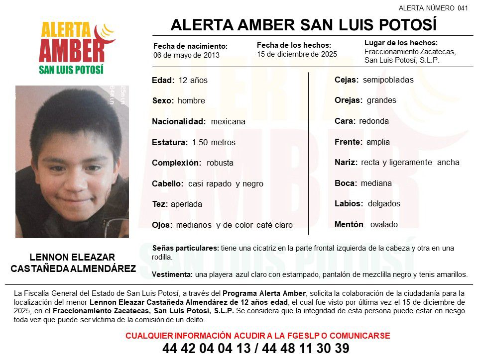 La Fiscalía General del Estado de San Luis Potosí activó una ficha de Alerta Amber para la localización de Lennon Eleazar Castañeda Almendárez, adolescente que tuvo contacto por última vez con sus familiares el 15 de diciembre de 2025, en el fraccionamiento Zacatecas, en la capital potosina.