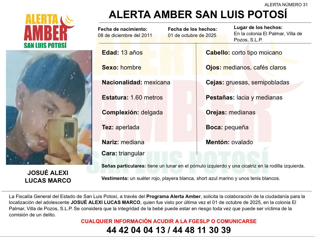 La Fiscalía General del Estado de San Luis Potosí (FGESLP) activó una Alerta Amber para localizar a Josué Alexi Lucas Marco, de 13 años de edad, quien fue visto por última vez el pasado 1 de octubre de 2025 en la colonia El Palmar, perteneciente al municipio de Villa de Pozos.