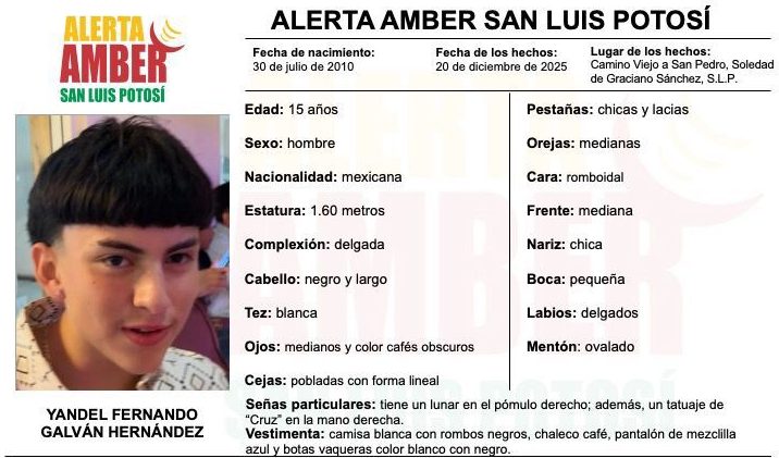 La Fiscalía General del Estado de San Luis Potosí (FGESLP), mediante los protocolos correspondientes, activó una ficha de Alerta Amber para la localización de Yandel Fernando Galván Hernández, quien fue visto por última ocasión el 20 de diciembre del presente año, en Camino Viejo a San Pedro, en el municipio de Soledad de Graciano Sánchez.