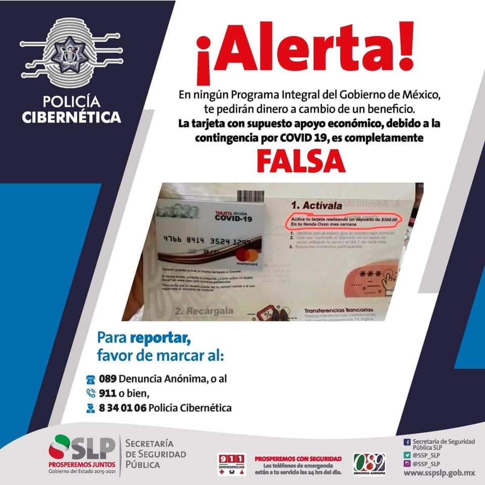 Ante la contingencia sanitaria originada por el brote de COVID-19, se han detectado la entrega de tarjetas con las mismas características que tienen la del Gobierno Federal, en las cuales se indica que para activarla, el titular debe realizar un depósito de cierta cantidad de dinero, por lo cual la Policía Cibernética alertó a la población ante este fraude.