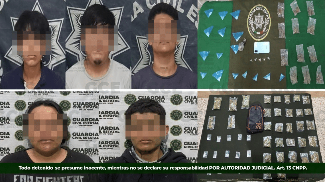 Uno de los hechos tuvo lugar en el municipio de Mexquitic de Carmona, donde efectivos de la GCE detuvieron a Claudia “N” de 31 años de edad y a Edwin “N” de 18 años, quienes fueron sorprendidos con 32 bolsas con marihuana y 14 dosis de metanfetaminas; por su parte, en el municipio de Ciudad Valles, quedaron detenidos tres masculinos, identificados como: Pedro “N”  y Juan “N”, ambos de 21 años, así como Rolando “N” de 27 años, tras asegurarles 16 dosis de “cristal”; 12 de marihuana; cinco de “crack” y un teléfono.