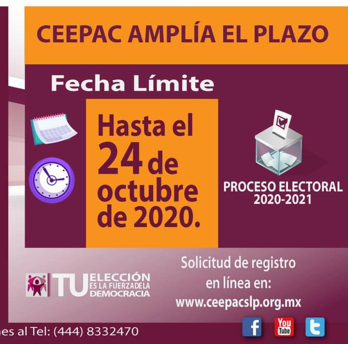 El Pleno del Consejo Estatal Electoral y de Participación Ciudadana (CEEPAC), aprobó en sesión extraordinaria virtual ampliar hasta el sábado 24 de octubre del año en curso, la solicitud de registros de las personas que aspiran a una candidatura independiente para los cargos de Gubernatura del Estado, Diputaciones de Mayoría Relativa y 58 Presidencias Municipales para el Estado de San Luis Potosí, para el Proceso Electoral Local 2020 – 2021.