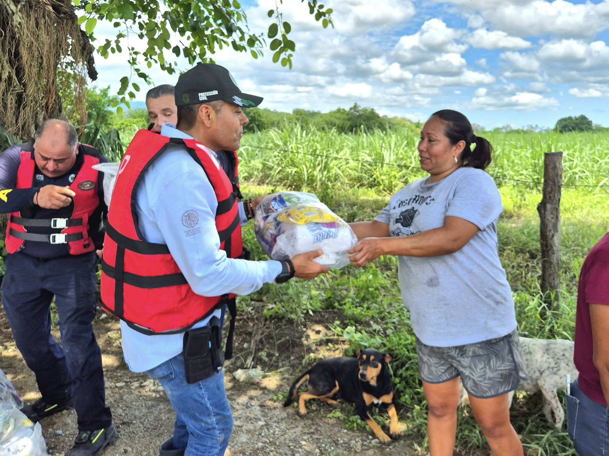 La primera comunidad visitada fue el ejido San Carlos, donde 40 familias quedaron aisladas desde el sábado por la creciente del río. A los pobladores se les entregaron despensas, medicamentos y se les prometió abastecerlos con agua potable. En el lugar, los habitantes señalaron un bordo construido dentro de una propiedad privada que estaría impidiendo el flujo del agua, provocando estancamiento y mayor afectación. El alcalde afirmó que buscarán derribarlo legalmente para liberar el paso del afluente y prevenir nuevas inundaciones.