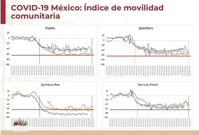 «Quisiera ver los datos de San Luis Potosí que mostraban una tendencia a la alza en las últimas semanas, sin embargo, en los últimos cinco días han mostrado un descenso en el movimiento y, a partir del 1 de junio, se ve también cómo sigue disminuyendo el movimiento o la proporción de gente que se mueve» precisaron.