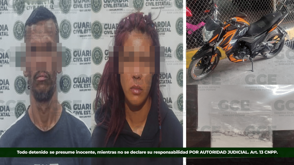 Los hechos ocurrieron en la capital potosina, sobre la colonia Simón Díaz, ahí fueron detenidos Nancy “N” de 27 años, quien ha sido detenida también por probables delitos contra la salud, así como José “N” de 44 años, asegurado en dos ocasiones por delitos contra la salud y robo. A ambos presunto se les aseguró una motocicleta color naranja, modelo 2022, que había sido robada de la colonia Jardines del Sur.