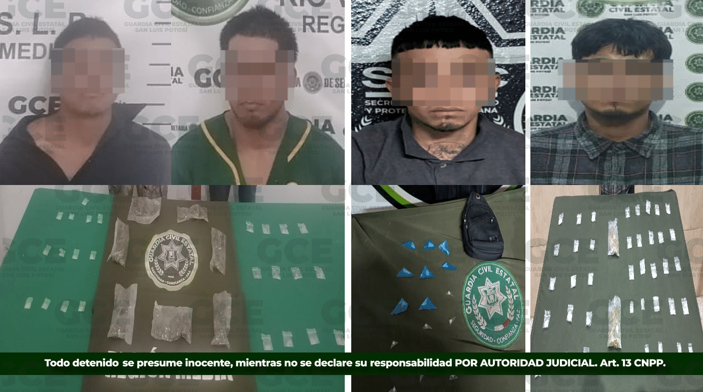 Uno de los hechos tuvo lugar en el municipio de Villa de Reyes, en donde efectivos de la GCE detuvieron a Luis “N” de 24 años de edad, luego de asegurarle 24 dosis de metanfetaminas, así como dos bolsas con marihuana y 15 dosis de cocaína; mientras que, en el municipio de Matehuala, elementos estatales detuvieron a Ángel “N” de 21 años, tras asegurarle ocho dosis de “cristal” y siete de crack; por último, en el municipio de Rioverde, se detuvo a Ángel “N” de 24 años y a José “N” de 25 años, tras asegurarles 29 dosis de “cristal” y seis bolsas con marihuana.