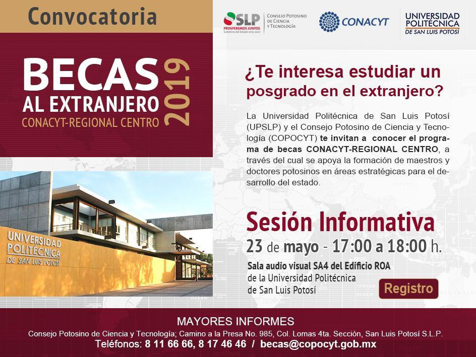 El Consejo Potosino de Ciencia y Tecnología (COPOCYT) y la Universidad Politécnica de San Luis Potosí, invitan a conocer el programa de becas al extranjero que ofrece el Consejo Nacional de Ciencia y Tecnología (CONACYT) para la región centro, a través del cual se apoya la formación de las y los maestros, y las y los doctores potosinos en áreas estratégicas para el desarrollo del estado.