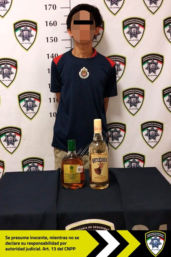 Al hacer contacto con él, le indicaron lo sucedido y luego de una revisión preventiva de seguridad, le fueron encontradas, en la mochila que portaba, dos botellas una de whisky Buchanan’s de 750 mililitros y una botella de tequila Cabrito de 950 mililitros.