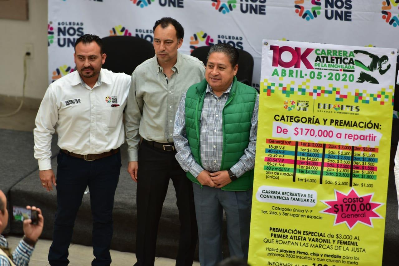 El Ayuntamiento de Soledad, encabezado por el alcalde Gilberto Hernández Villafuerte, presentó la séptima edición de la Carrera Atlética de la Enchilada 2020, donde se ofrecerán atractivos premios a los competidores con una bolsa de 170 mil pesos a repartir, en el marco de la Feria Nacional de la Enchilada.