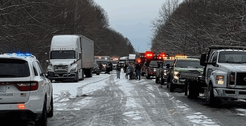 El accidente, ocurrido en los carriles con dirección al oeste, generó caos total: autos, camiones y tractocamiones terminaron desperdigados a lo largo de la carretera, algunos incluso fuera de la vía. Las autoridades informaron que no hubo víctimas fatales ni lesiones graves, aunque varias personas resultaron con heridas menores. La vía permaneció cerrada durante al menos seis horas mientras los equipos de emergencia retiraban los vehículos siniestrados y limpiaban el hielo.