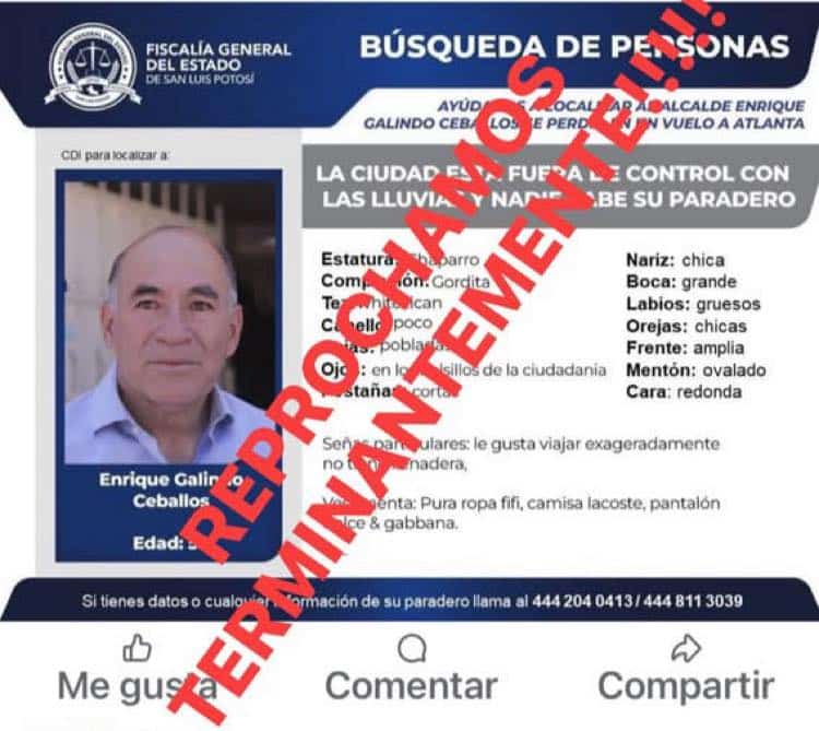 Ante los problemas viales ocasionados por los encharcamientos que dejaron las lluvias recientes en la capital potosina, comenzaron a circular en redes sociales imágenes del alcalde Enrique Galindo Ceballos con un diseño similar al de las fichas de búsqueda oficiales, en tono de burla por la falta de respuesta a la situación. Aunque algunos intentaron justificarlo como “sátira política”, el hecho provocó indignación y fue calificado como una grave falta de respeto por colectivos de familias de personas desaparecidas.
