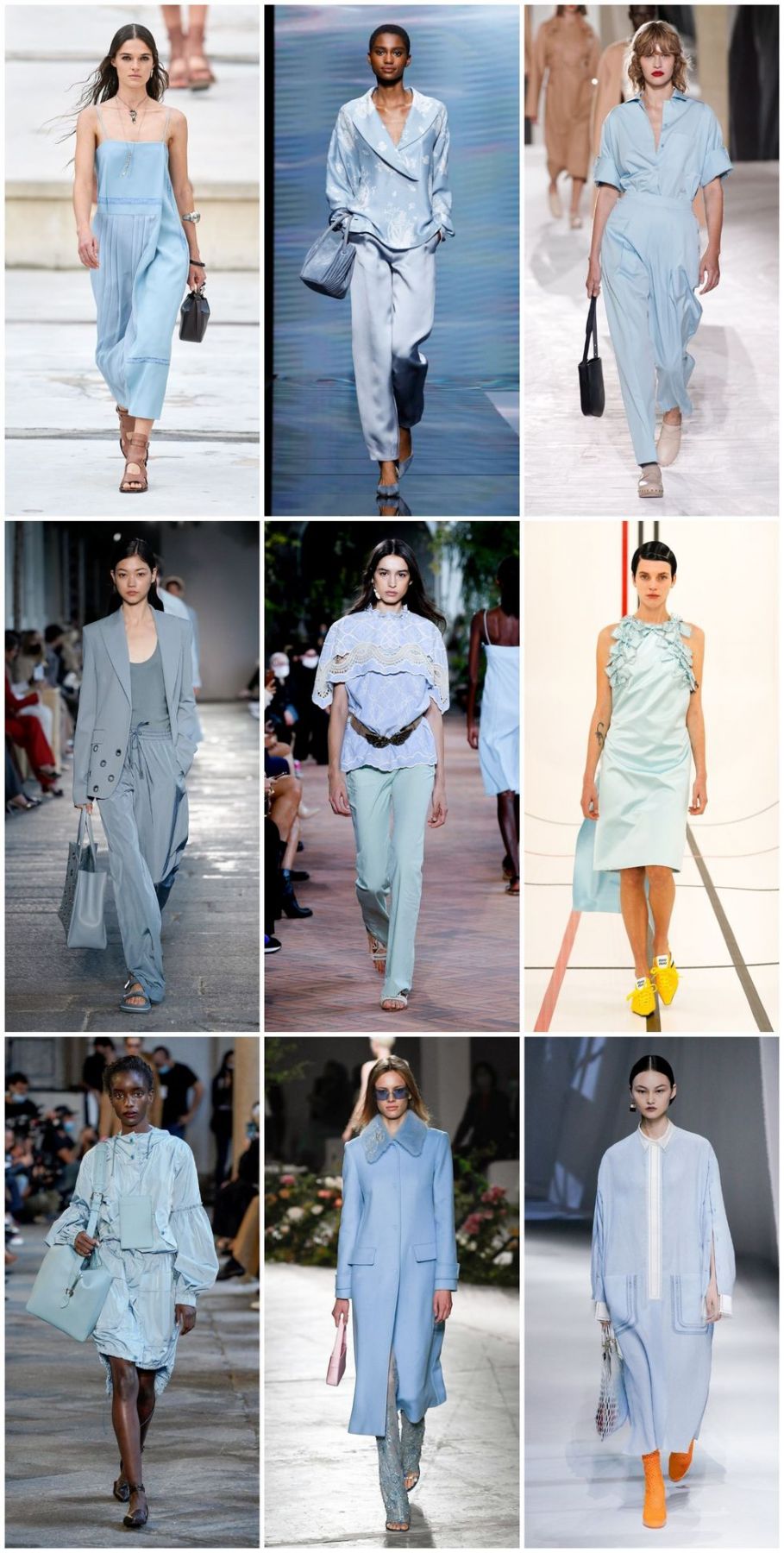 Que el color de las mascarillas quirúrgicas se halla ganado un lugar en las pasarelas no es casualidad, eso si que ha sido reinventado en clave optimista y fresco. El azul pastel favorece a la piel morena tal como lo presenta en los vestidos de Chloé hasta los conjuntos pijameros de Armai hasta la sastrería de Boss.