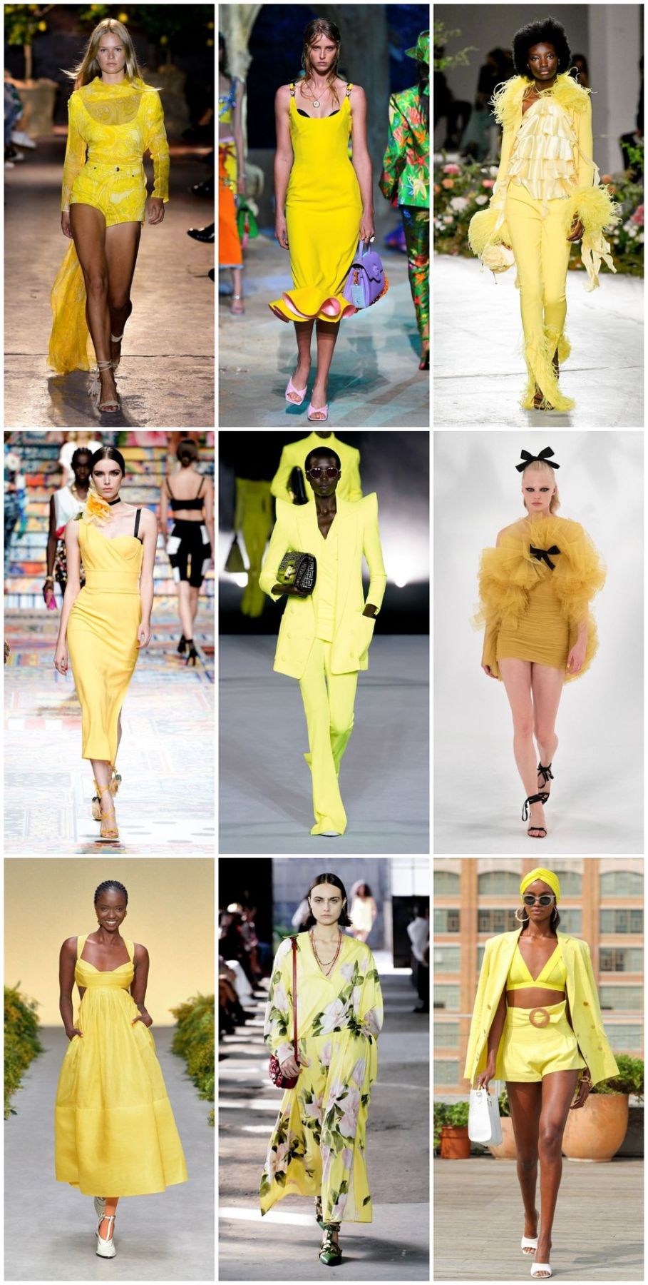 Amarillo calendula, amarillo limón y un poco de amarillo flúor, siguen los dictados de Pantone y su yellow illuminanting, presentes especialmente en vestidos, esta ácida tonalidad se convierte en una de las colecciones más alegres de las firmas Versace, Balmain o Etro. Puedes combinarlos con dorados, tono tierra y tintes blancos.