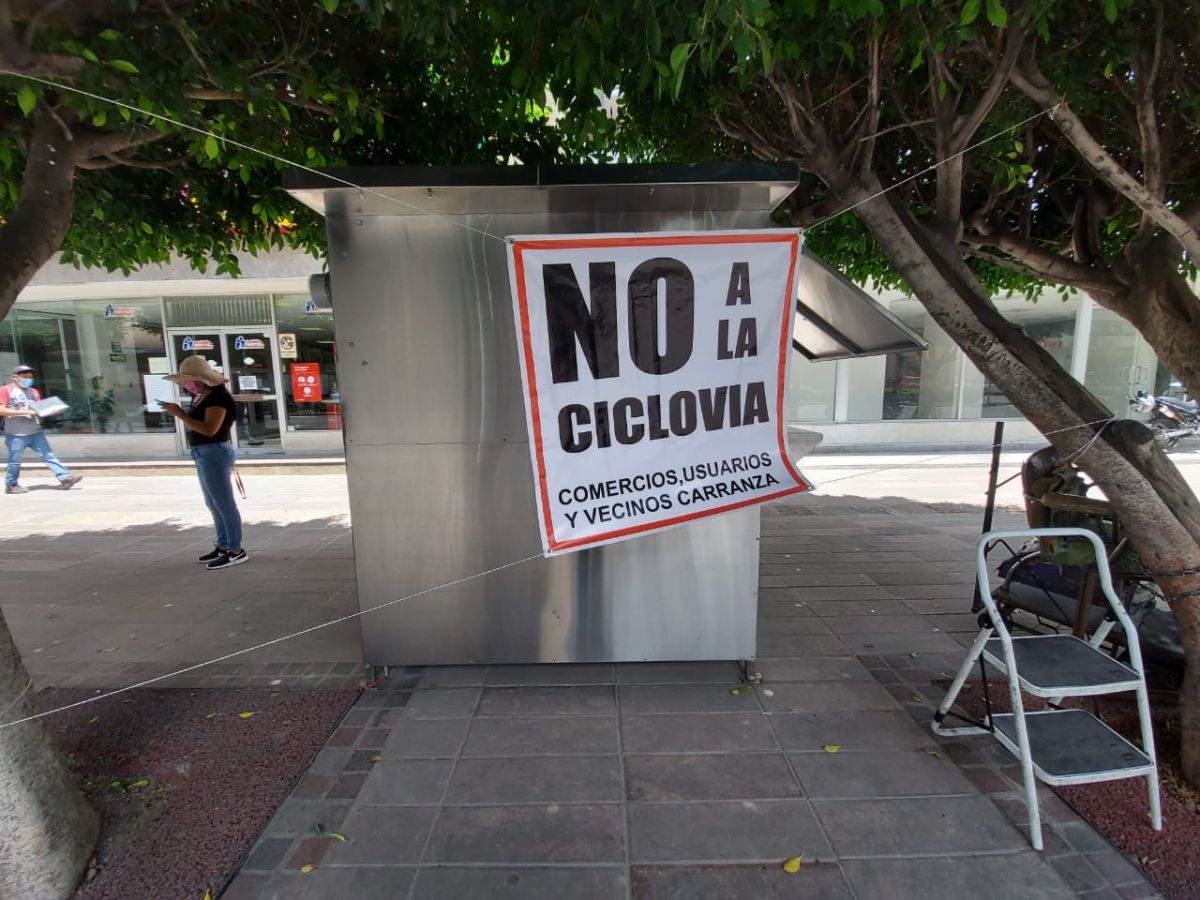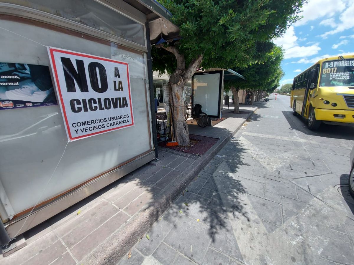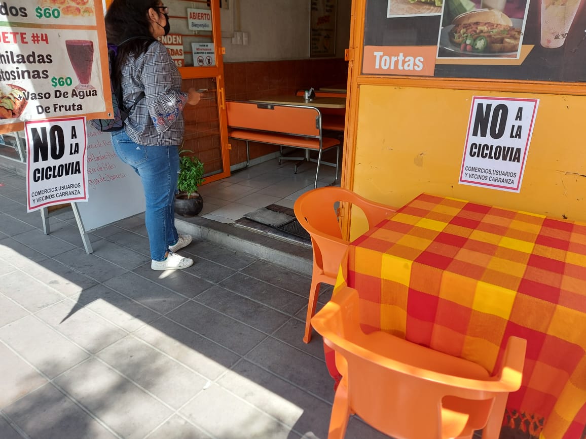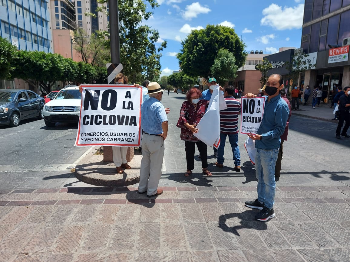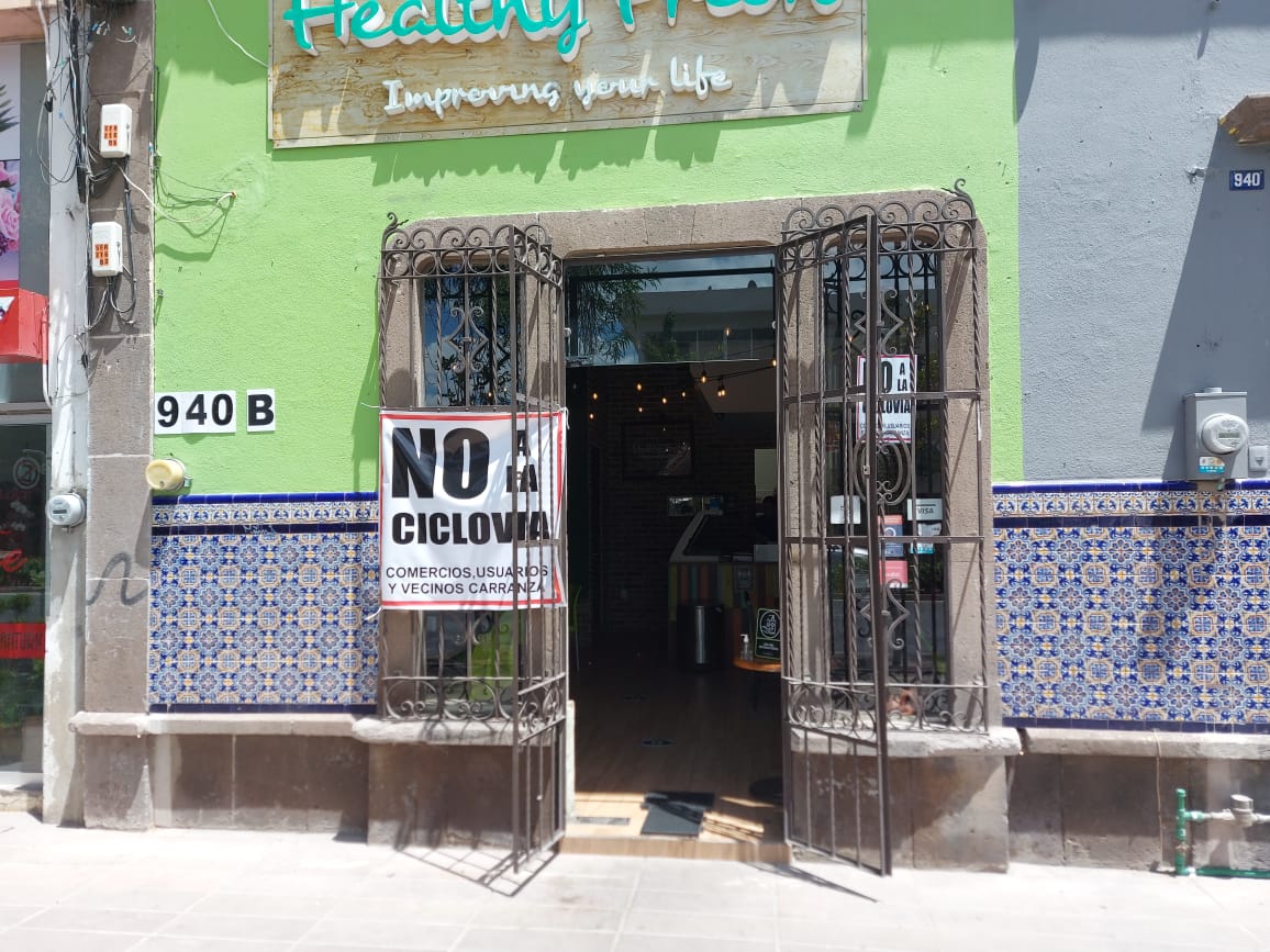 Además de tramitar un amparo federal contra la imposición de la ciclovía, comerciantes y ciudadanos de la avenida Carranza bloquearon uno de los carriles de dicha arteria para manifestar su rechazo a dicho proyecto y colocaron carteles en sus fachadas con un rotundo “No a la ciclovía de Nava ”.