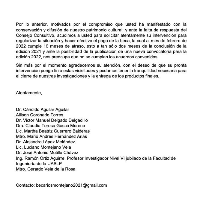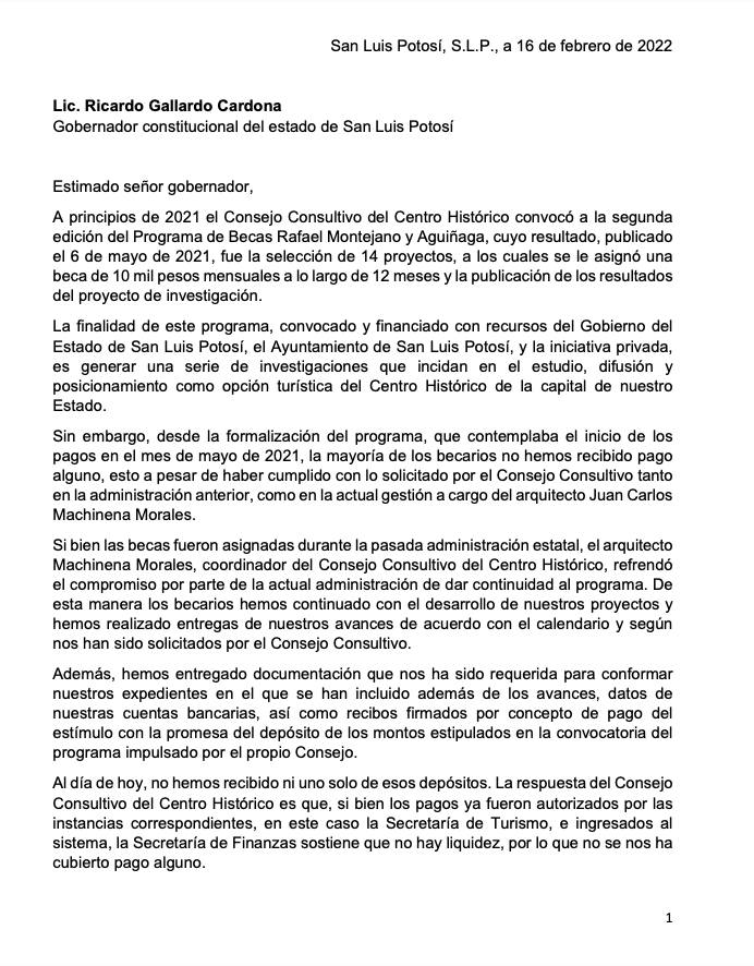 En ese sentido, los afectados solicitan la intervención del gobernador Ricardo Gallardo a fin de que garantice el pago de un beneficio que ya se ganaron y que debe cubrirse pues corresponde a un programa oficial. «Estamos profundamente preocupados ya que, hasta el mes de febrero, se nos adeuda el pago de 10 meses y estamos próximos al cierre de este programa. Solicitamos su intervención para poder solucionar este problema y lograr concluir con éxito nuestros proyectos de investigación que serán un importante aporte para el estudio, conservación y difusión del patrimonio histórico, artístico y cultural de la ciudad de San Luis Potosí» comentan los becarios.