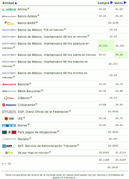El dólar se cotiza en $20.33 pesos mexicanos, esto representa una disminución del 0.01% con respecto al día de ayer.