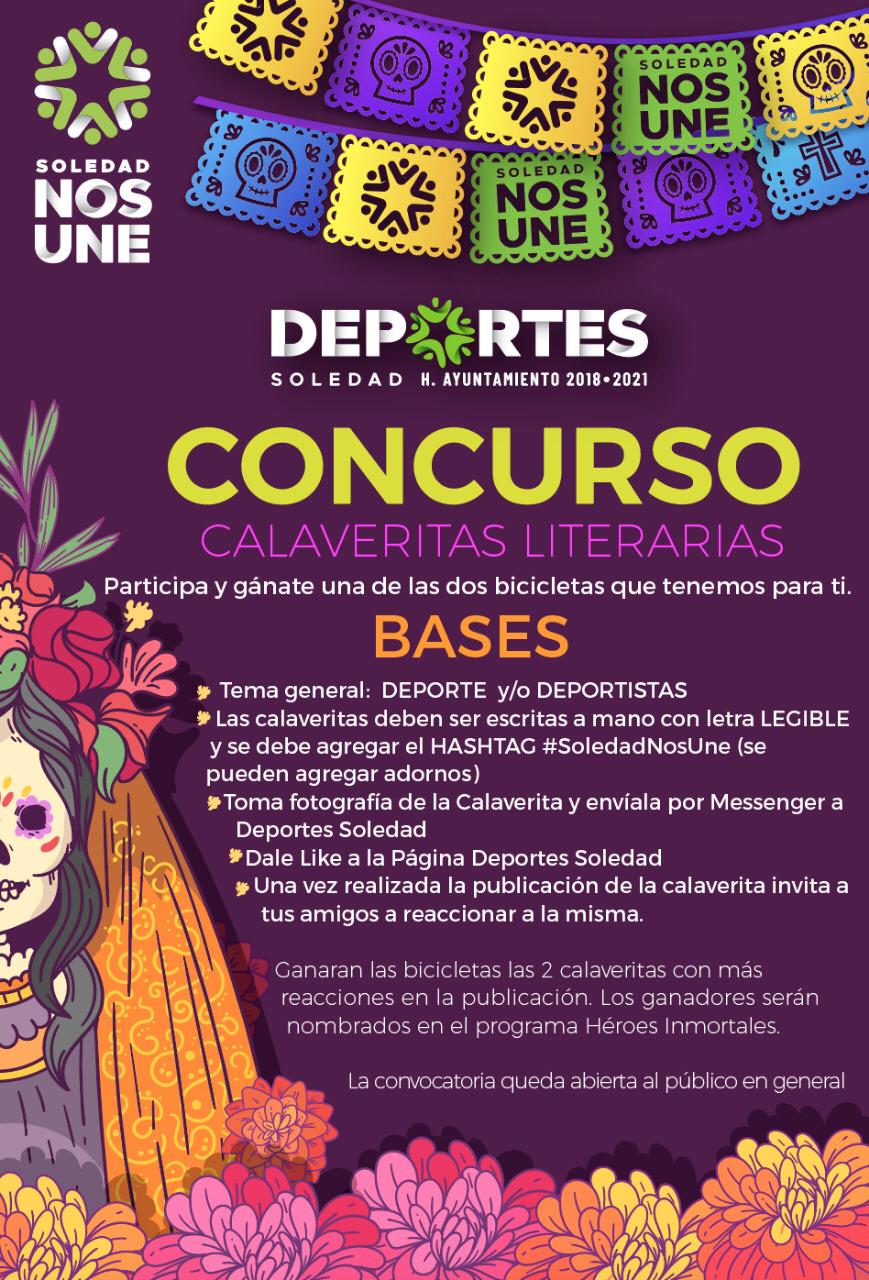 El Ayuntamiento de Soledad a través de la Coordinación Municipal de Deportes, invita a la población en general a participar en el concurso Calaveras Literarias, dentro de las actividades del Ayuntamiento de Soledad con motivo de la programación para la celebración de Día de Muertos “Vive nuestras tradiciones”.