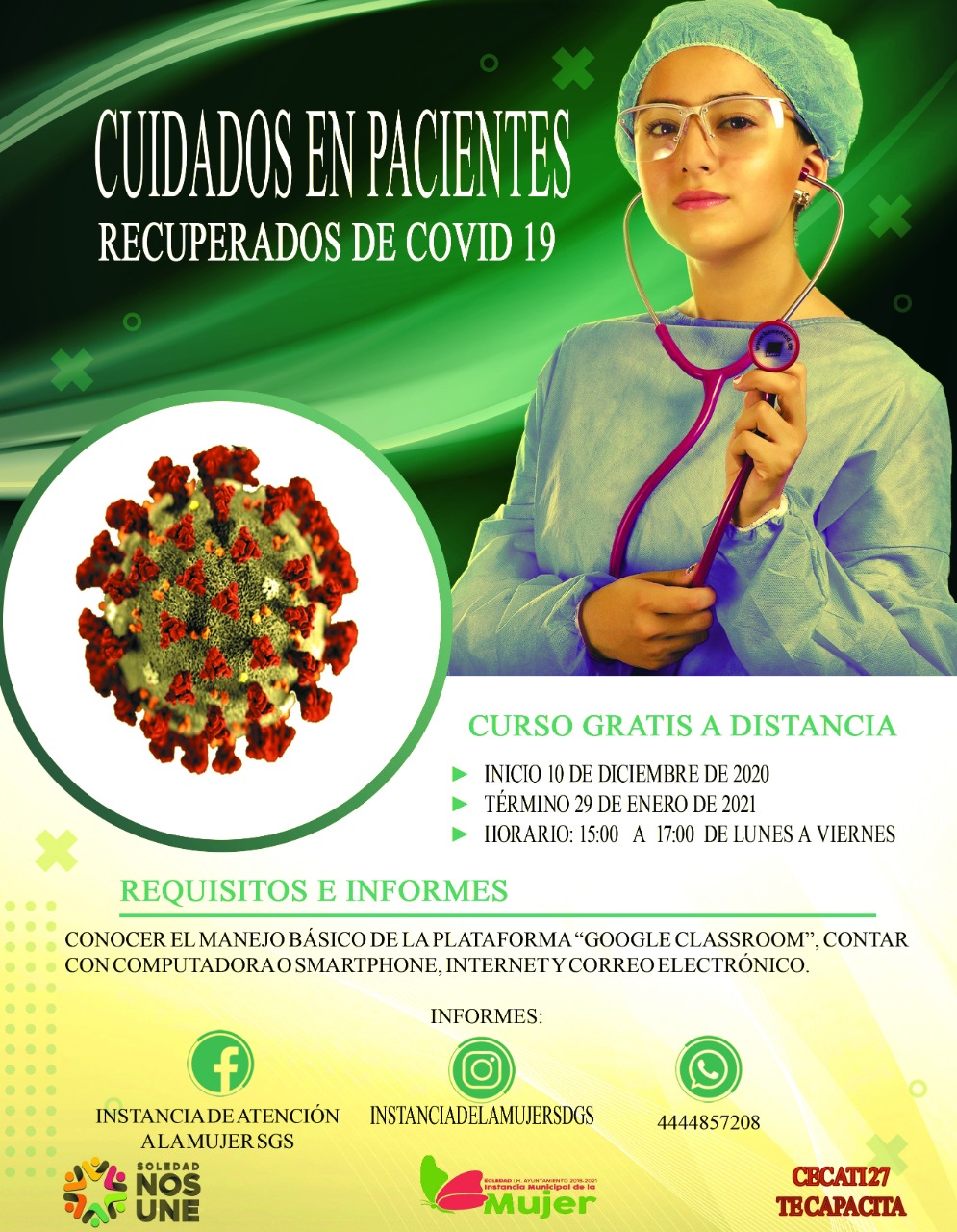 La Instancia Municipal de la Mujer en Soledad, invita a la ciudadanía al curso “Cuidados en pacientes recuperados de COVID-19”, el cual será completamente gratuito y a distancia, con la finalidad de implementar un aprendizaje y convertirse en agente de cambio como respuesta sanitaria ante la actual pandemia.