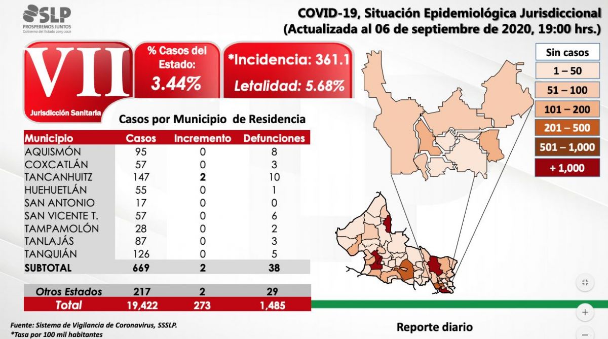 La entidad suma 19 mil 422 pacientes positivos y 1,485 defunciones Covid. La tasa de letalidad incrementa y se ubica en 7.65 fallecidos por cada 100 infectado de coronavirus.