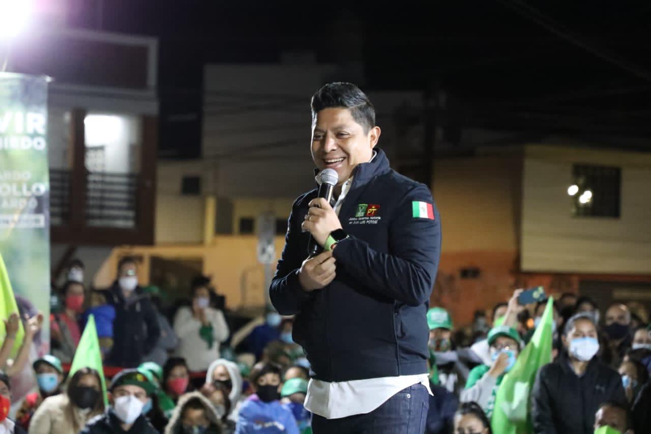 Entre las banderas Rojiverdes del Partido Verde Ecologista de México (PVEM) y Partido del Trabajo (PT) y cientos de carteles con muestras de afecto, “El Pollo” Gallardo dijo que erradicará el burocratismo de los institutos antes citados, así como de la secretaría de Cultura, para que amplíen sus servicios a las y los jóvenes de todo el Estado, pues actualmente sus servicios son excluyentes y limitados.