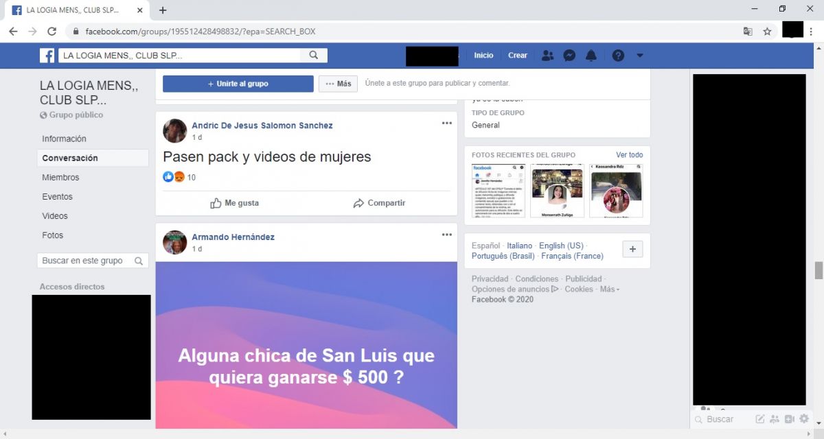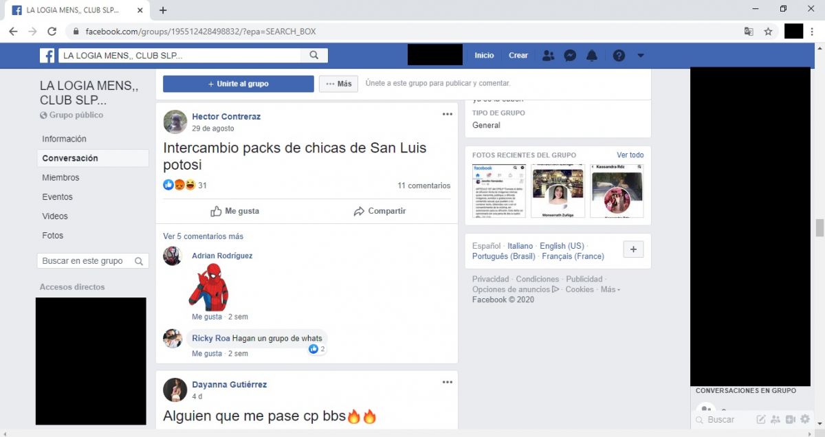 Fue apenas esta semana cuando los usuarios de redes sociales comenzaron a denunciar públicamente el regreso de La Logia Mens Club SLP. El grupo, creado el 16 de febrero de 2020, ya cuenta con más de tres mil 100 miembros y muestra actividad reciente, aunque, en apariencia, ya únicamente se utiliza como punto de contacto pues, de ahí, se vinculan a grupo de WhatsApp o Messenger en donde, presuntamente, se comparte pornografía, fotografías y videos de mujeres potosinas.