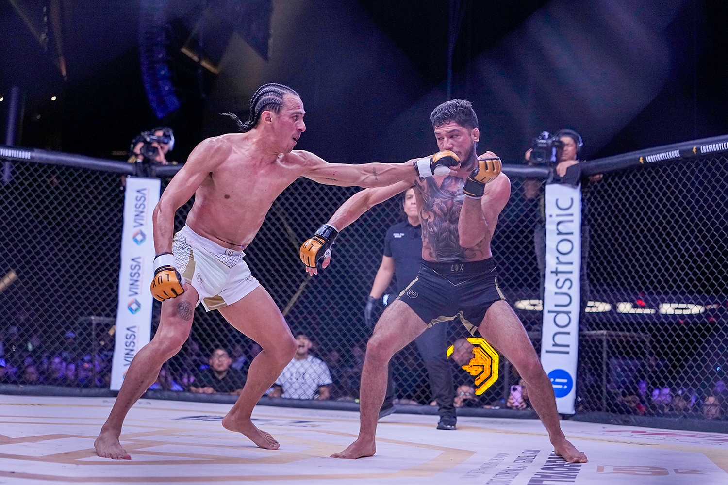 La pelea, válida por la categoría gallo, inició con “Torito” López queriendo llevar inmediatamente a la lona a Vázquez, quien resistió a dicho propósito ante la mirada de Gerardo Cruz, tercero sobre la jaula.