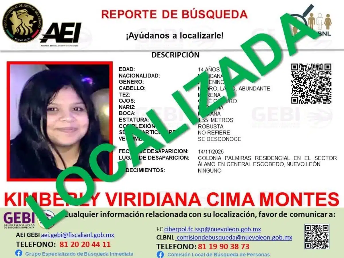 La Fiscalía de Nuevo León confirmó la localización en Nuevo Laredo, Tamaulipas, de Kimberly Viridiana, una adolescente de 14 años reportada como desaparecida el 14 de noviembre en Escobedo, presuntamente tras comunicarse con un desconocido mediante la plataforma Roblox.