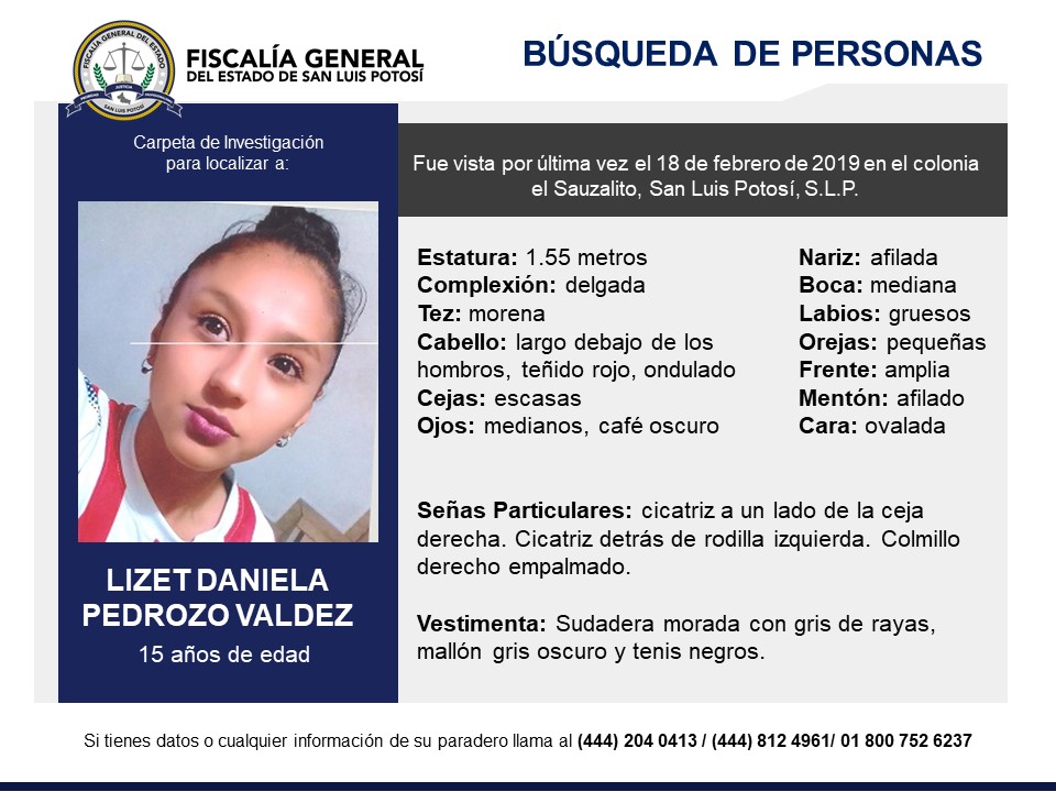 Desde el 18 de febrero, la joven Lizet Daniela Pedrozo Valdez de 15 años de edad fue vista por última vez, cerca de su casa en la colonia el Sauzalito. Desde entonces, sus familiares acudieron a la Fiscalía General del Estado para que los ayudaran a encontrarla. A través de redes sociales, iniciaron con la pesquisa pero, hasta el momento, Lizet no ha aparecido.