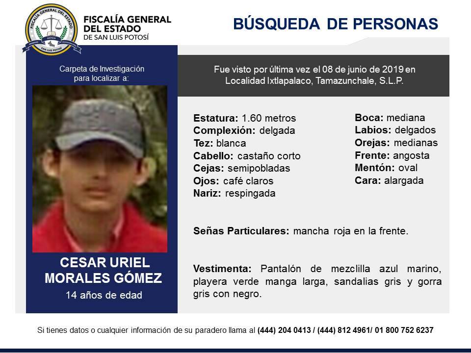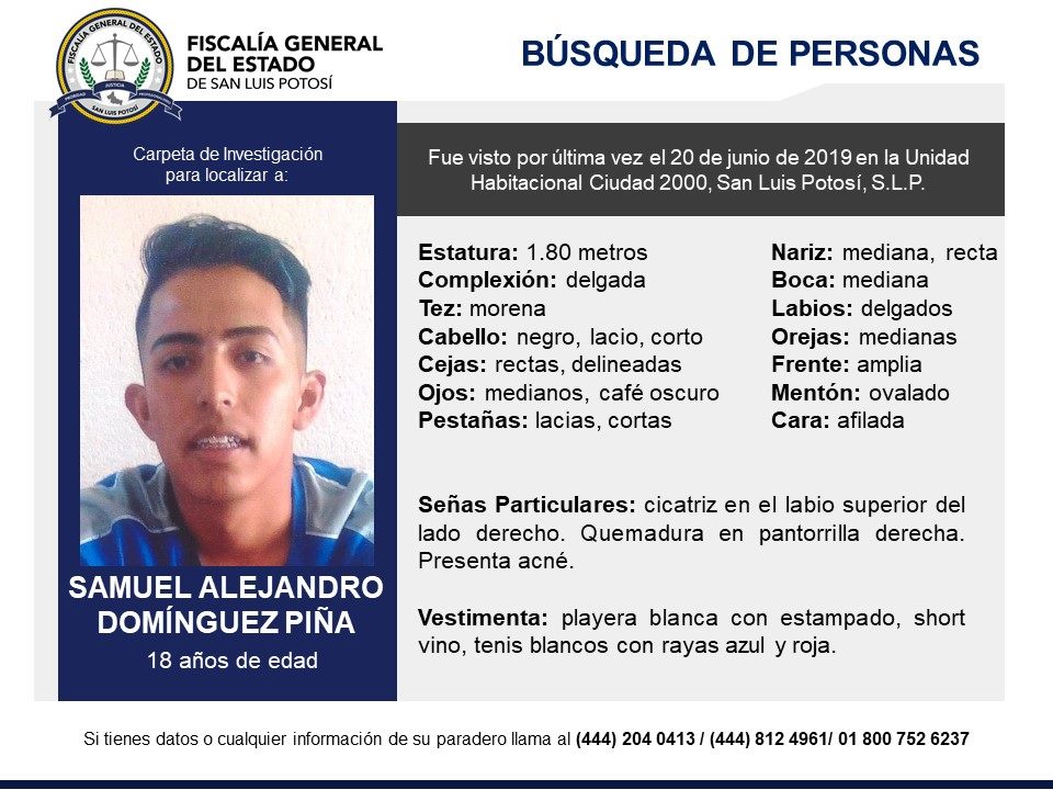 En Soledad de Graciano Sánchez, desapareció Casandra Braydelin Torres Colunga de 15 años de edad. El 13 de junio la vieron por última vez en la colonia Azaleas y vestía overol short, blusa blanca con negro y tenis de tela negros. En redes sociales, la Fiscalía poste su pesquisa hasta el 23 de junio.