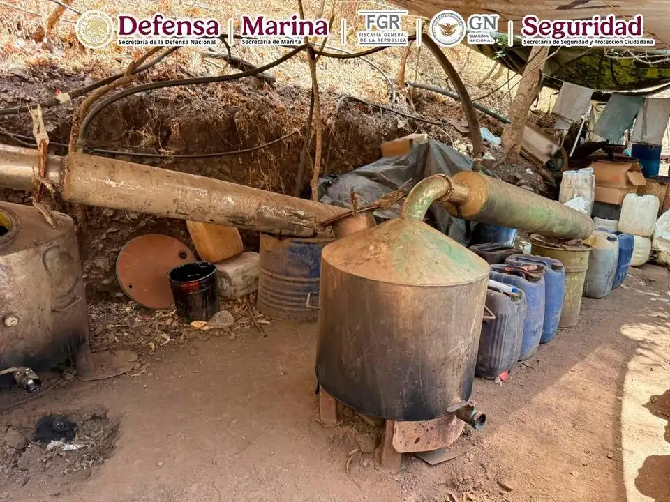 El operativo, encabezado por la Agencia de Investigación Criminal con apoyo de la Secretaría de la Defensa Nacional y la Marina, permitió asegurar 150 kilos de metanfetamina, más de 6 mil litros y casi 900 kilos de precursores químicos, así como una pista clandestina.