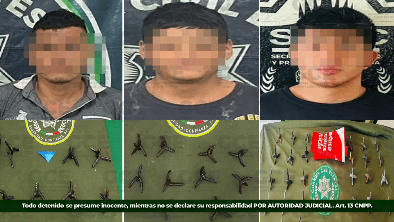 El primer aseguramiento se dio en Ciudad Valles, donde efectivos de la GCE detuvieron a Lázaro “N” y Christian “N”, ambos de 30 años, así como Elías “N” de 21 años, luego de asegurarles 17 objetos “poncha llantas” y tres dosis de metanfetaminas; por su parte, en la zona centro de Cedral, agentes estatales detuvieron a Brayan “N” de 21 años, luego de asegurarle 30 artefactos de varilla denominados como “poncha llantas”.