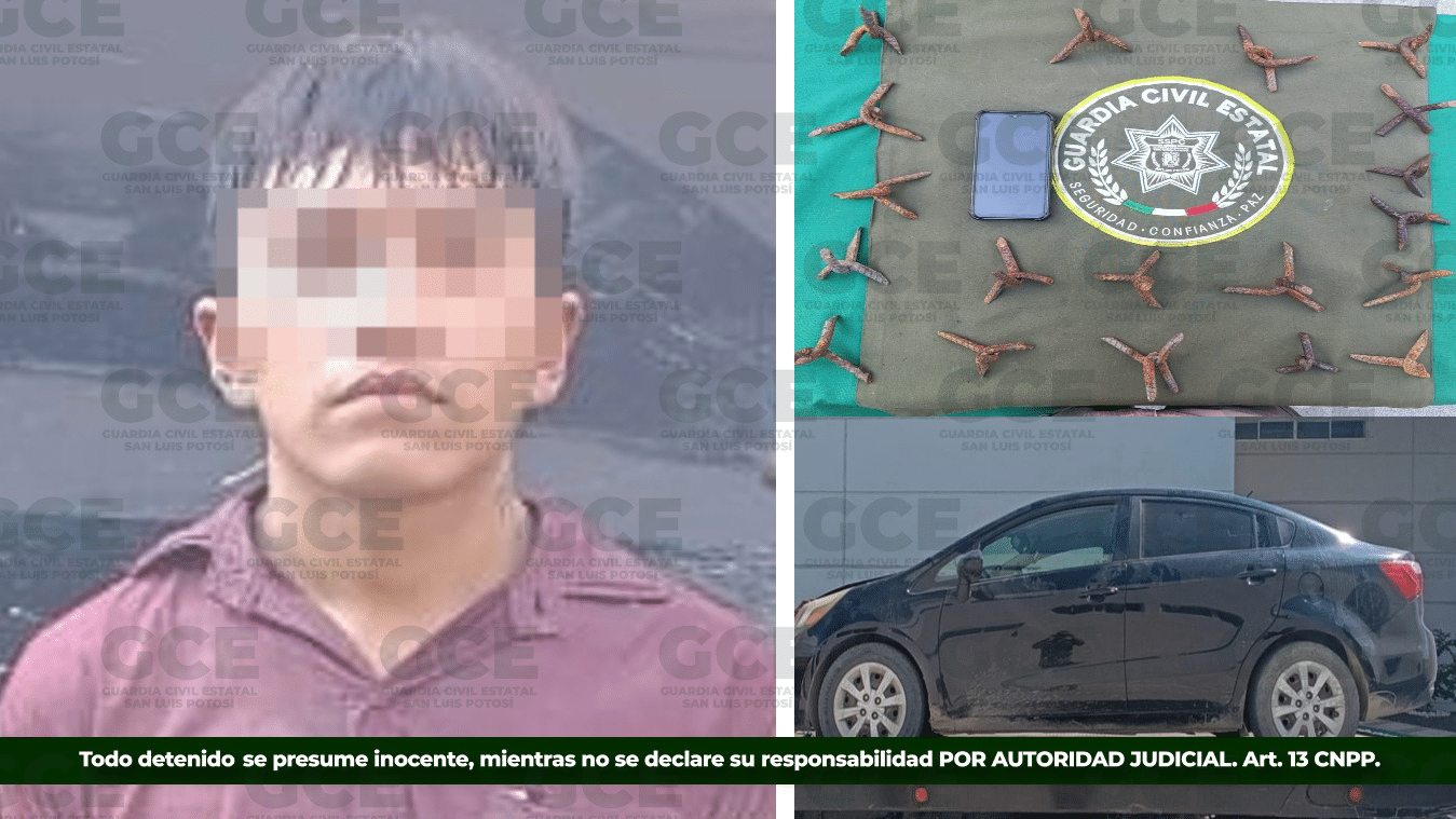 La detención tuvo lugar en la zona centro del municipio, asegurándoles 19 artefactos metálicos conocidos como “poncha llantas” y un automóvil Kia color negro de procedencia extranjera.