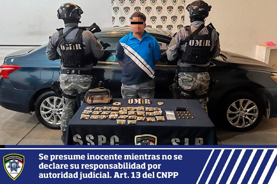 Al realizar la inspección preventiva, los oficiales aseguraron 29 dosis de marihuana, dos bolsas con droga tipo “cristal”, un cargador color negro con 12 cartuchos útiles calibre 9 milímetros, así como un teléfono celular.
