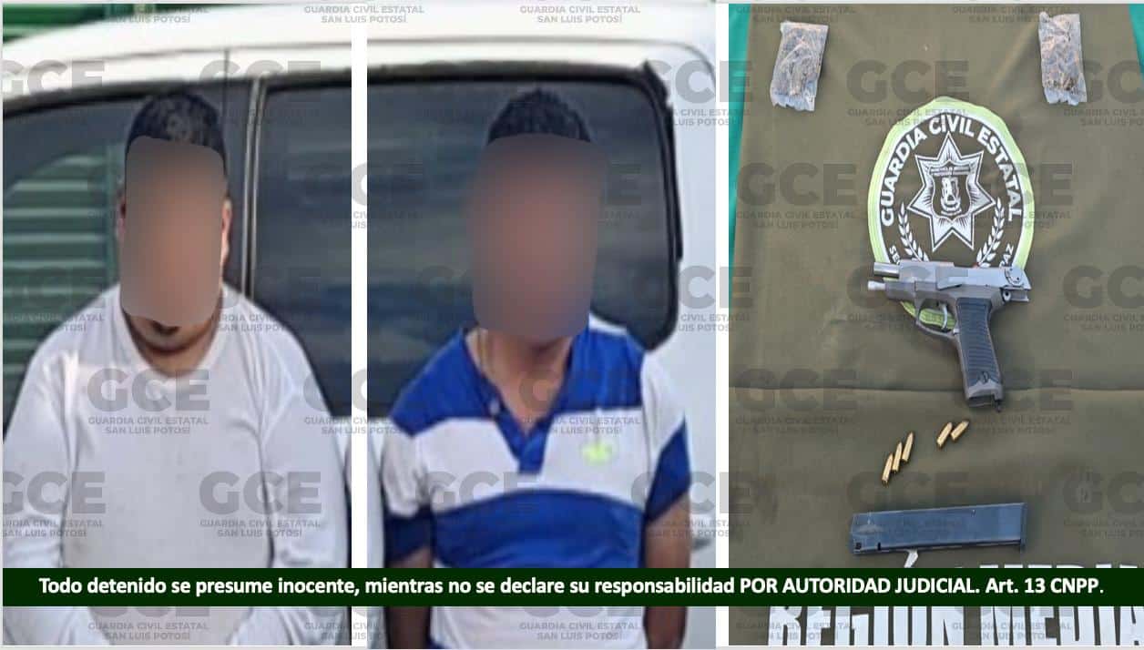 Como parte del dispositivo de seguridad “Zona Media Segura”, elementos de la Guardia Civil Estatal (GCE) detuvieron a dos hombres en el municipio de Rioverde, luego de asegurarles un arma de fuego, cartuchos útiles, droga y un vehículo en el que se transportaban.