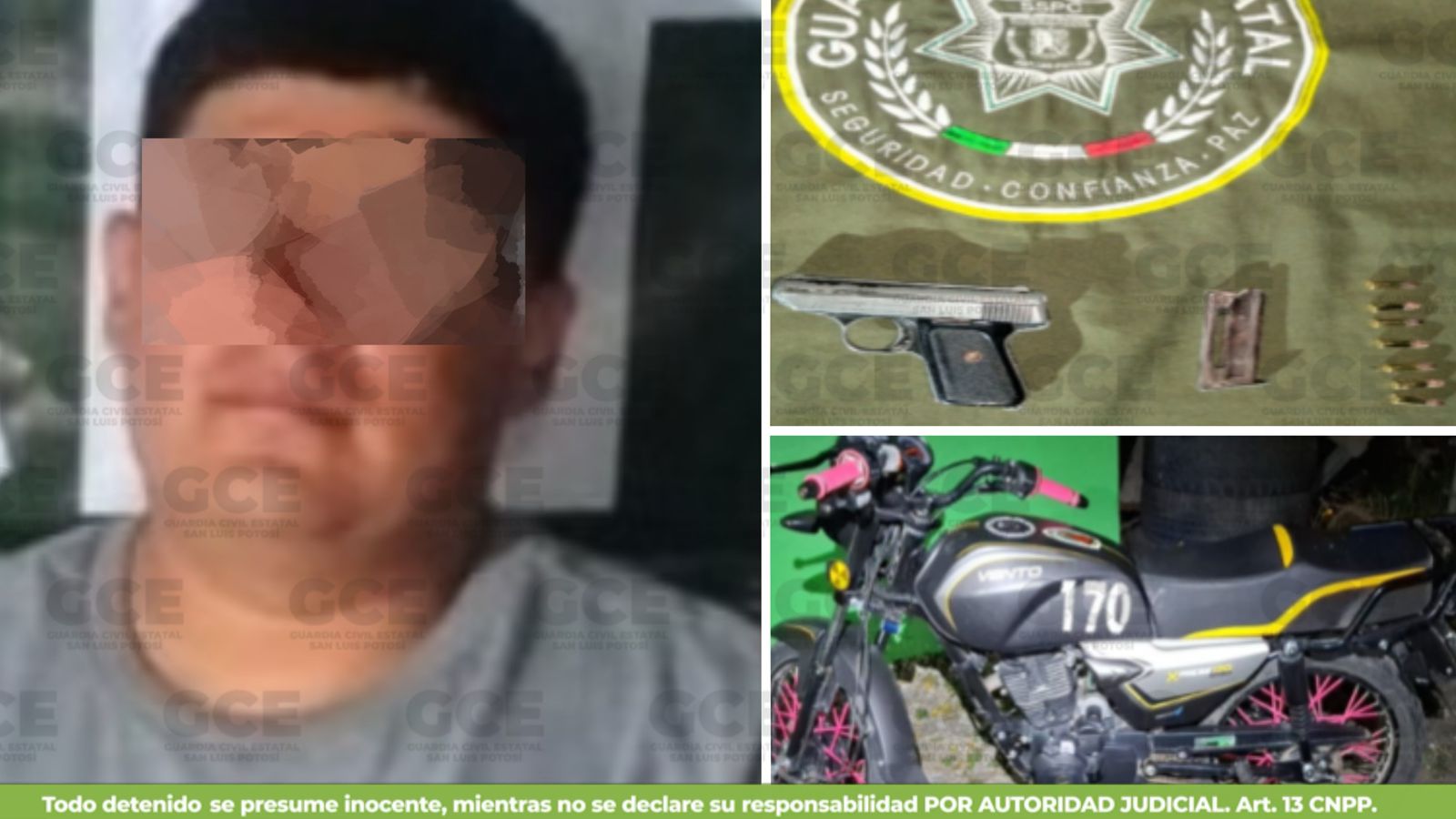 De acuerdo con el informe oficial, al presunto se le encontró en posesión de una pistola calibre .22 milímetros, así como un cargador, siete cartuchos útiles y una motocicleta marca Vento, modelo 2026.