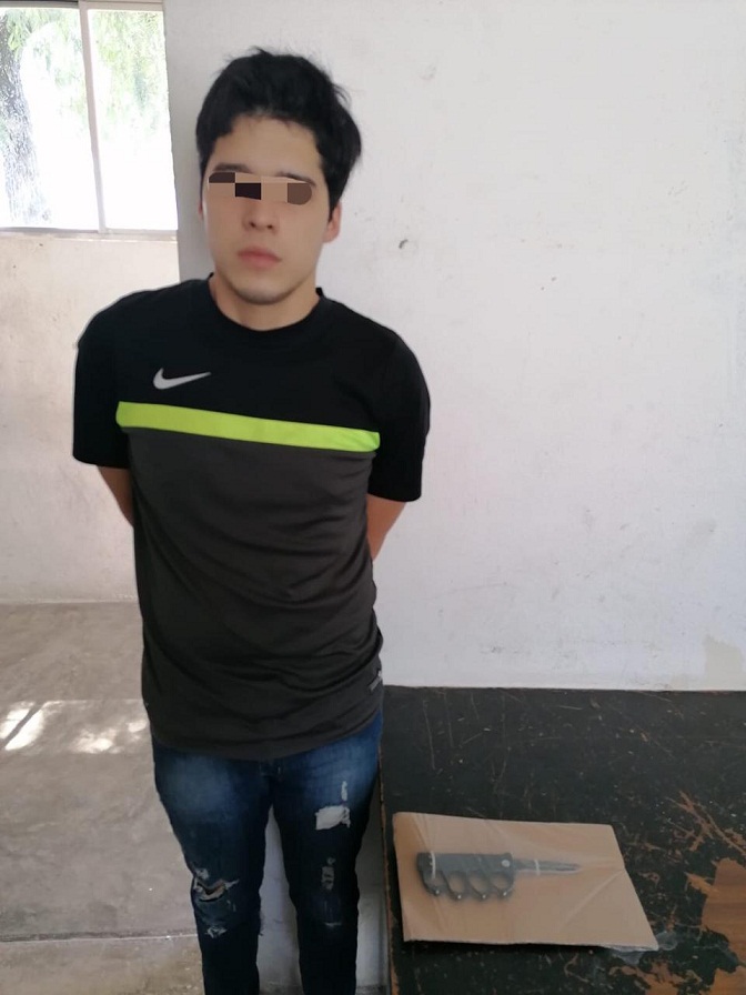 A Luis Antelmo N., de 23 años de edad, se le encontró un arma blanca con empuñadura en forma de bóxer con hoja metálica de 9.5 centímetros en color negro de metal fajado en la parte derecha de su pantalón.