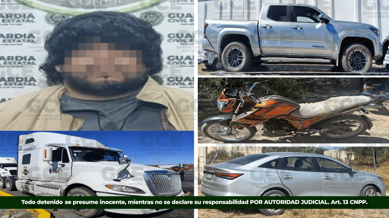 El primer aseguramiento tuvo lugar en Villa de Pozos, donde fue detenido Fernando “N”, de 38 años, al ser sorprendido a bordo de un tractocamión color blanco que contaba con reporte de robo en Tijuana, Baja California.