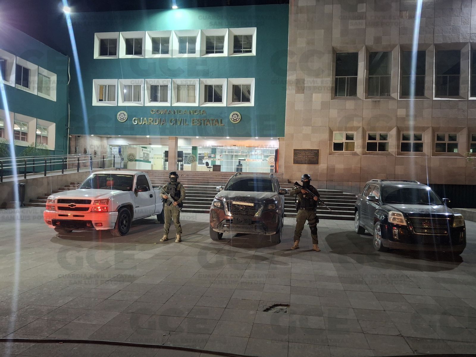 En el sitio fueron aseguradas: Una camioneta Nissan Frontier color rojo, sin placas, con un chaleco táctico negro en su interior. Una camioneta GMC Terrain color negro, sin placas. Una camioneta Chevrolet Silverado color blanco, sin placas.