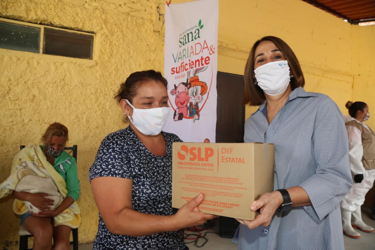 En visita a las colonias Santuario y General I. Martínez, Lorena Valle Rodríguez, Presidenta de la Junta Directiva del Sistema Estatal para el Desarrollo Integral de la Familia (DIF), realizó la entrega de apoyos alimentarios, ayudas técnicas, paquetes para bebé y libros, como parte de las acciones que se implementan para apoyar a la población en condiciones de desventaja durante la contingencia por el Covid-19.
