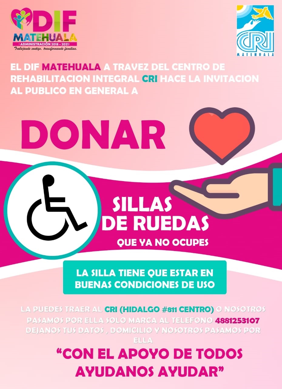 El Sistema Municipal DIF de Matehuala a través del Centro de Rehabilitación Integral invita la ciudadanía a unirse para continuar apoyando a uno de los sectores más vulnerables, por lo que lanza una campaña para donación de sillas de ruedas, este Centro brinda atención a personas con alguna discapacidad, además de apoyar a quien requiere de algún aparato auxiliar, como en éste caso las sillas de ruedas, sin embargo a pesar de las gestiones y el poder acercar y beneficiar a un gran número de personas con sillas de ruedas a quien lo necesita, nunca es suficiente, y hacen falta más sillas para continuar apoyando.