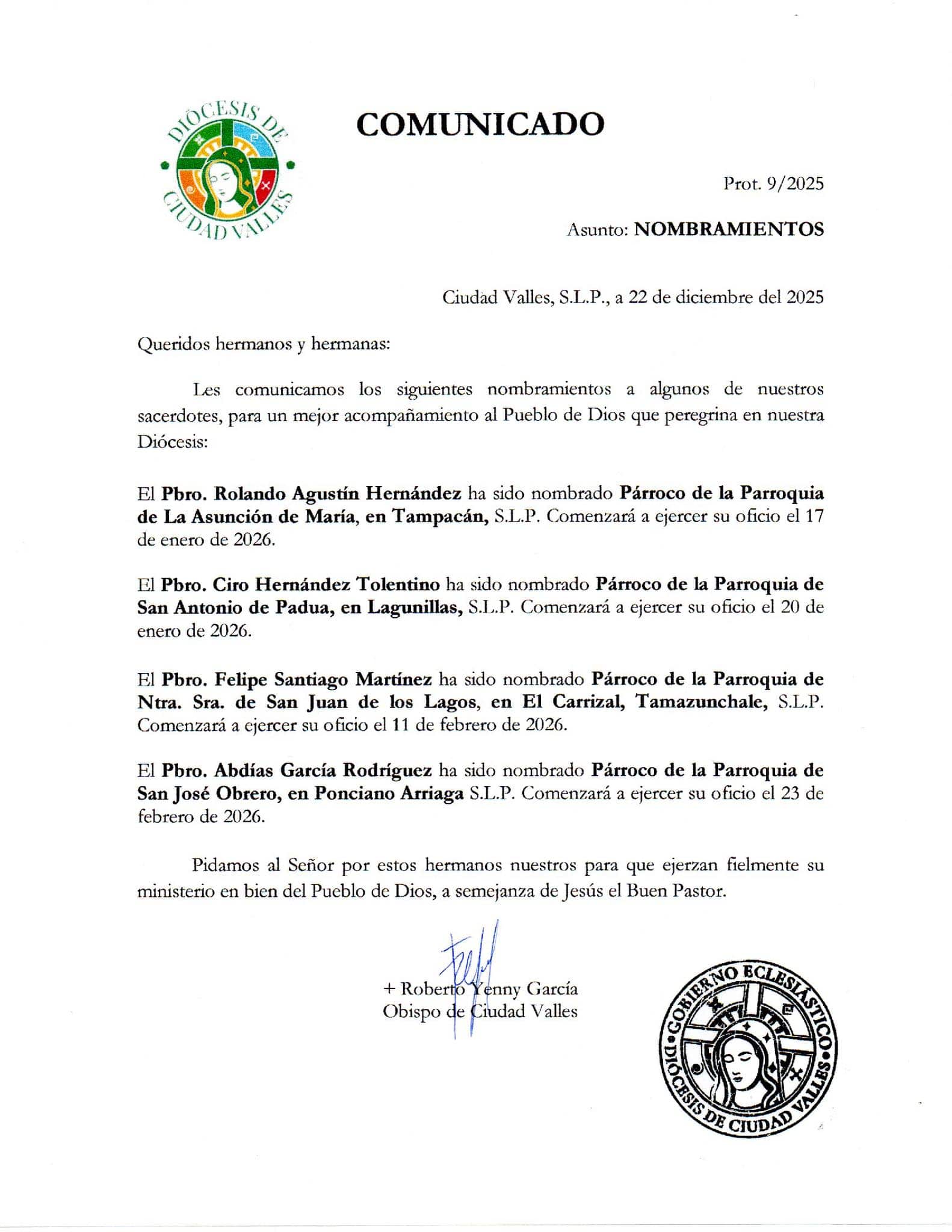 Ciudad Valles, S.L.P.– La Diócesis de Ciudad Valles dio a conocer una serie de nombramientos sacerdotales que entrarán en vigor durante los primeros meses de 2026, con el objetivo de seguir fortaleciendo el acompañamiento pastoral y espiritual del Pueblo de Dios en las distintas comunidades de la región.