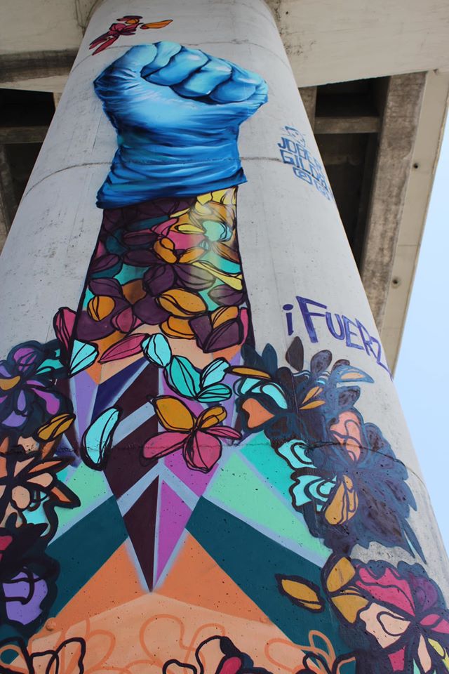El segundo mural muestra un antebrazo que sale de un conjunto de flores y formas coloridas; en lo alto culmina con el puño cerrado cubierto con un guante quirúrgico, a un costado simplemente se puede leer ¡Fuerza!