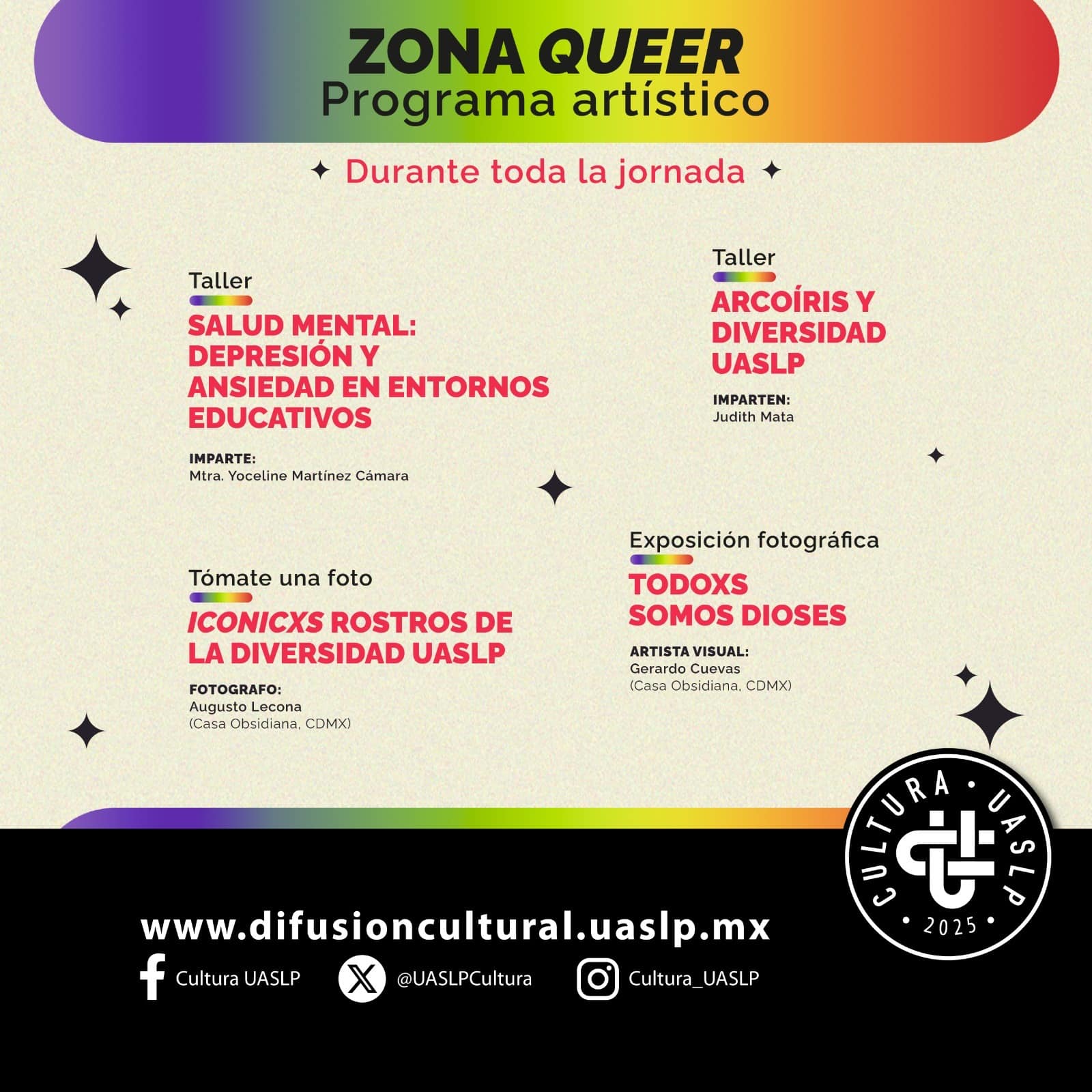 La programación completa del PRIDE Cultural UASLP 2025 puede consultarse en las redes sociales de Cultura UASLP y en el sitio web oficial: www.difusioncultural.uaslp.mx.