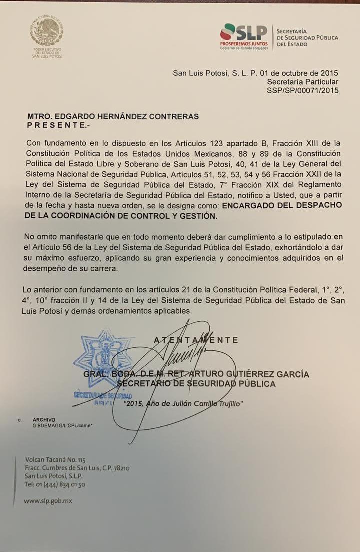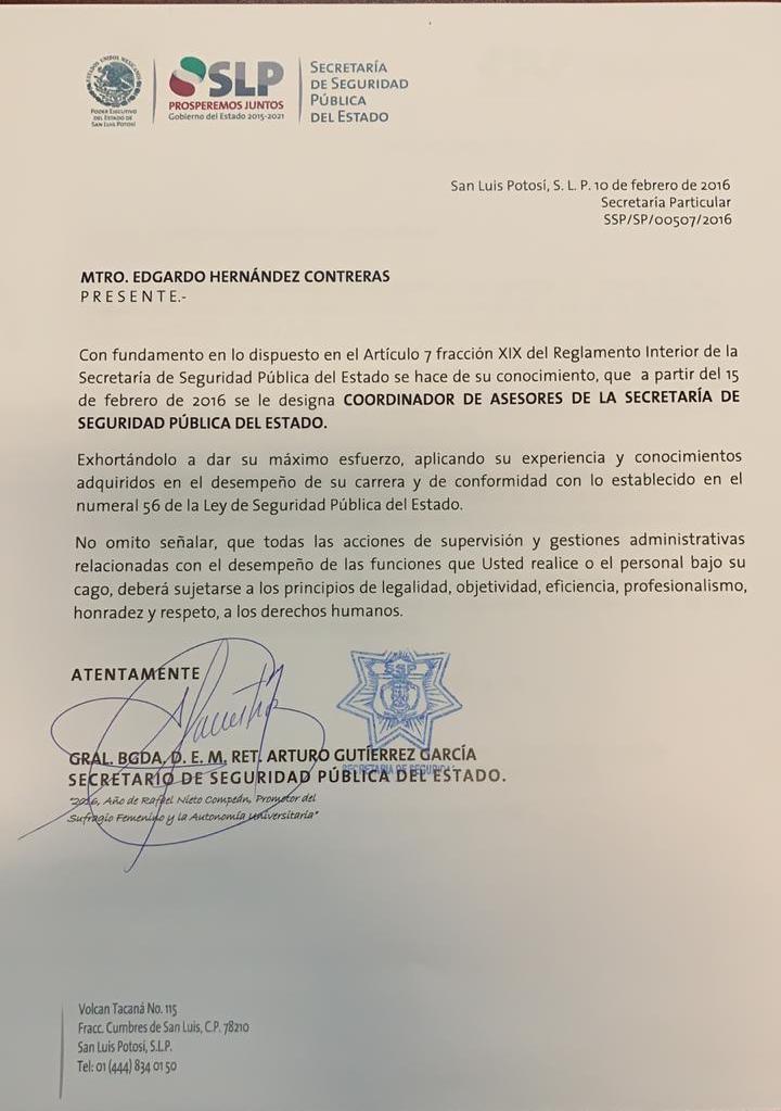 Para comprobar su dicho, Edgardo Hernandez presentó los originales de los nombramientos que le fueron otorgados para desempeñarse como coordinador de Control y Gestión de la SSPE, cargo que ocupó de septiembre de 2015 a febrero de 2016, y el de coordinador de asesores, el cual ocupó de febrero de 2016 hasta el momento que renunció el secretario general, Arturo Gutierrez García.