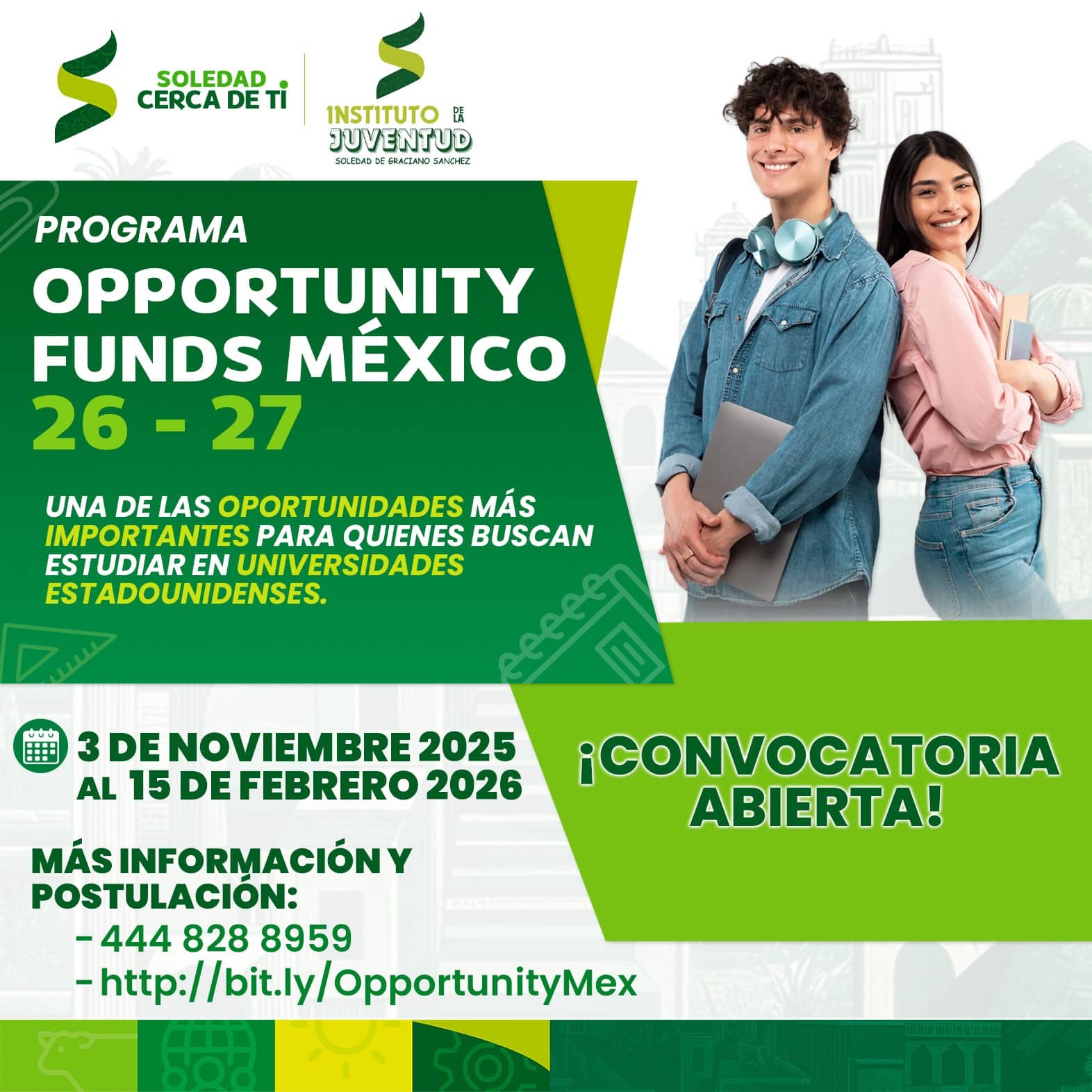 El Instituto Municipal de la Juventud reiteró su llamado a las y los estudiantes soledenses para conocer los requisitos y enviar su postulación a través del enlace oficial: https://bit.ly/OpportunityMex con el que el Gobierno Municipal destaca que continuar acercando este tipo de oportunidades reafirma su apuesta por una juventud preparada, con visión global y con la capacidad de transformar de manera positiva a sus comunidades.