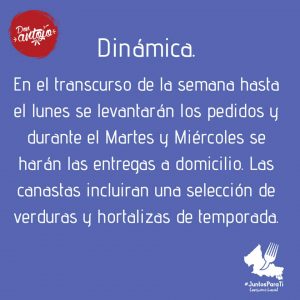 Señalan que en el transcurso de la semana hasta el lunes se estarán levantando los pedidos por los distintos medios señalados y entre el martes y el miércoles se llevarán las verduras y hortalizas frescas a quienes lo hayan solicitado. El servicio tendrá un costo aproximado de $100.00 a $220.00 pesos y con el envío incluido.