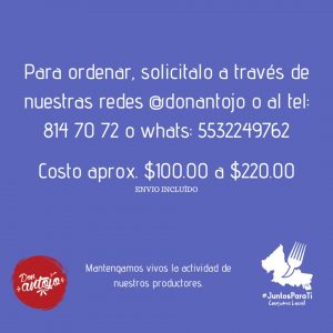 Para realizar tu pedido, puedes hacerlo a través de sus redes, ya sea por Facebook Don Antojo o en Twitter @DonAntojo, al teléfono 4448 14 70 72 o por WhatsApp al 55 3224 9762. De forma sencilla tomarán tu pedido y lo entregarán a la puerta de tu domicilio.