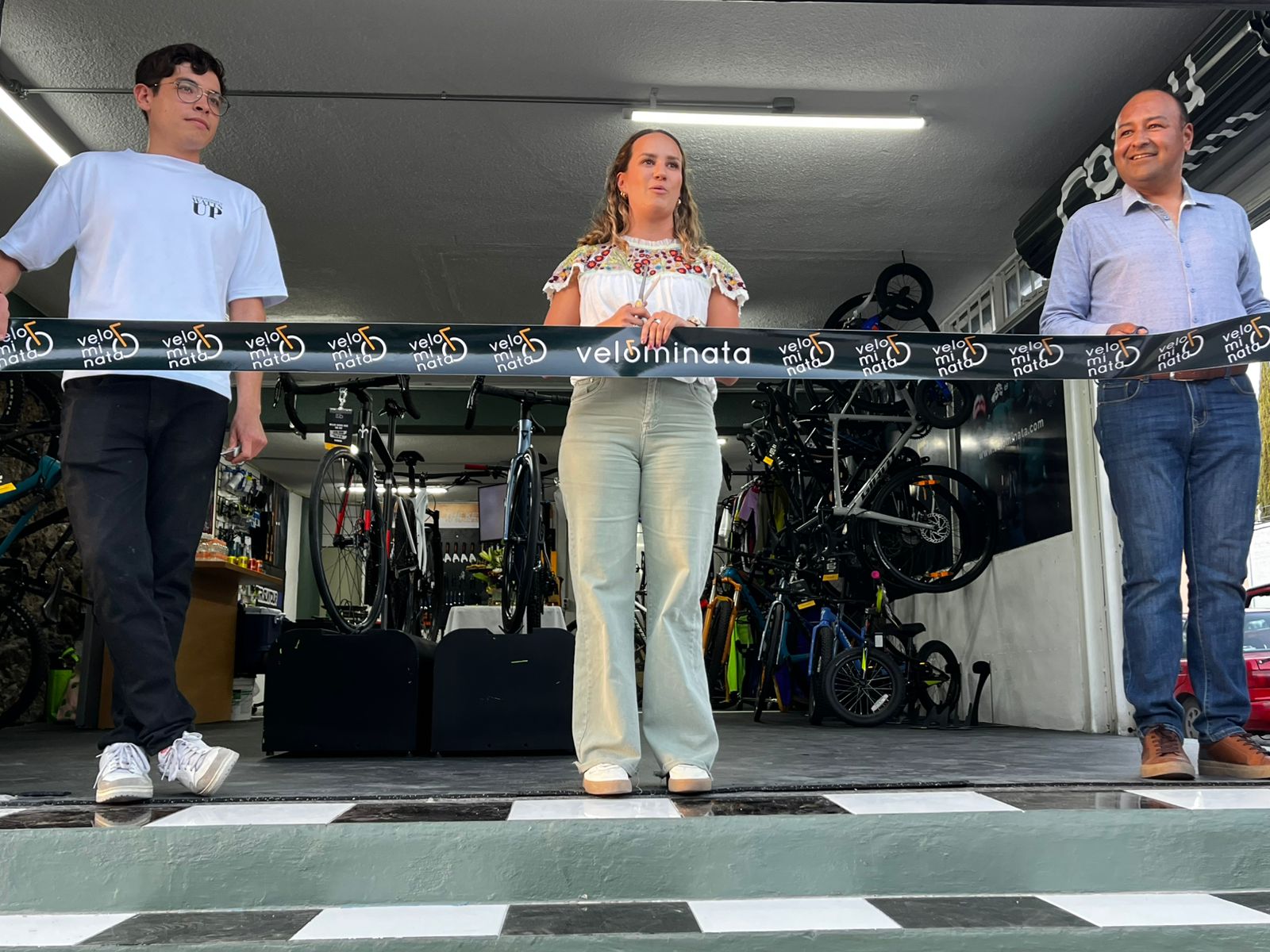 El corte de listón del moderno establecimiento estuvo encabezado por Macarena Barroso; Luis Pineda, coordinador de Velominata en San Luis, y Manuel Cruz, Presidente de Fomento Potosino al Ciclismo.